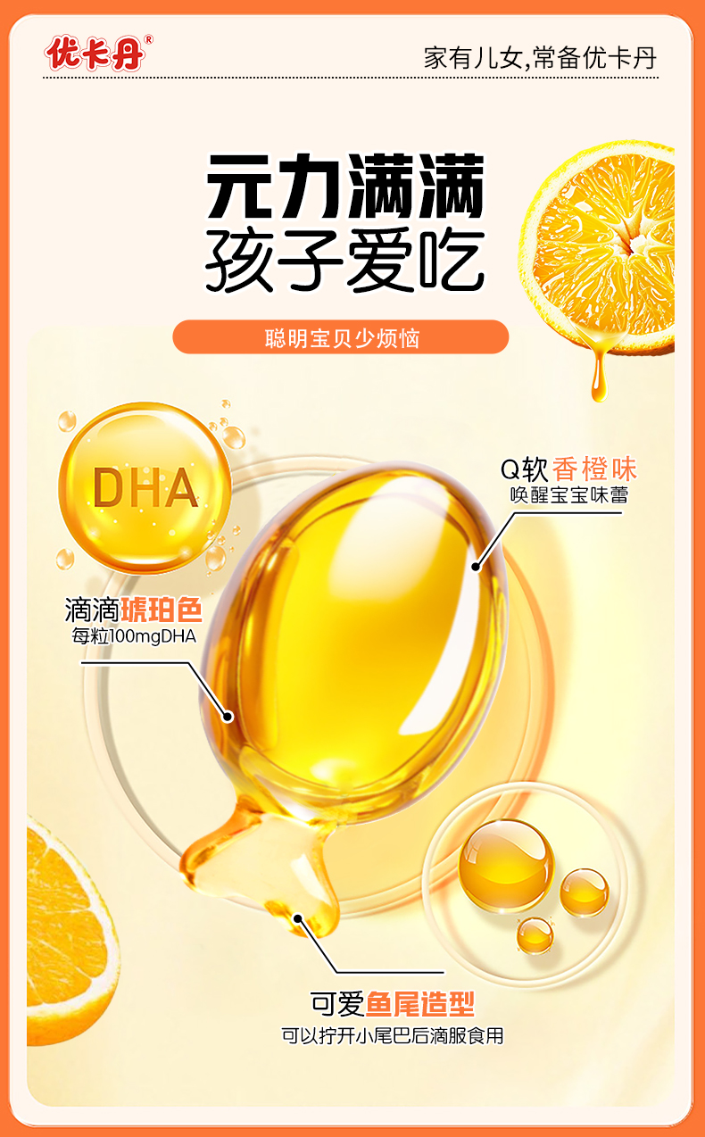 很多DHA產(chǎn)品都帶有難以避免的腥味,孩子一聞就躲,喂起來特別費(fèi)勁。而優(yōu)卡丹這款凝膠糖果采用清新香橙口味,酸甜可口,質(zhì)地Q軟,就像孩子喜歡的小零食。